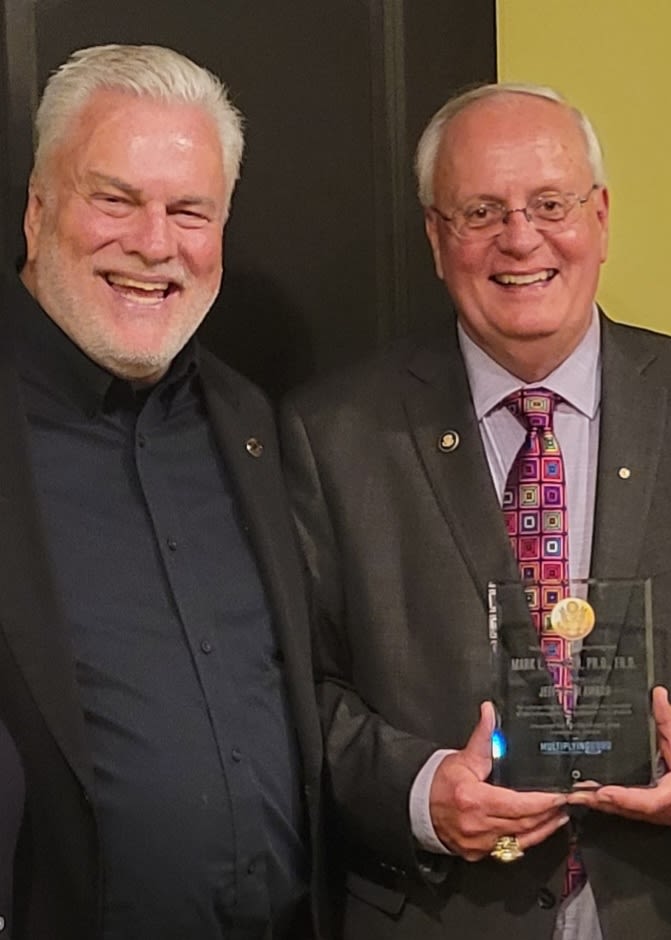 Mark Eutsler (MS’84), right, received the Jefferson Award for outstanding servant leadership in community activism, effectiveness, and impact. Presented by Multiplying Good, the Jefferson Awards highlight professionals and community leaders and celebrate the positive changes they’ve brought about in their communities. The award was presented by Steve Abel (P’76, DP’78), left, professor emeritus of pharmacy practice and former associate vice provost for engagement at Purdue.