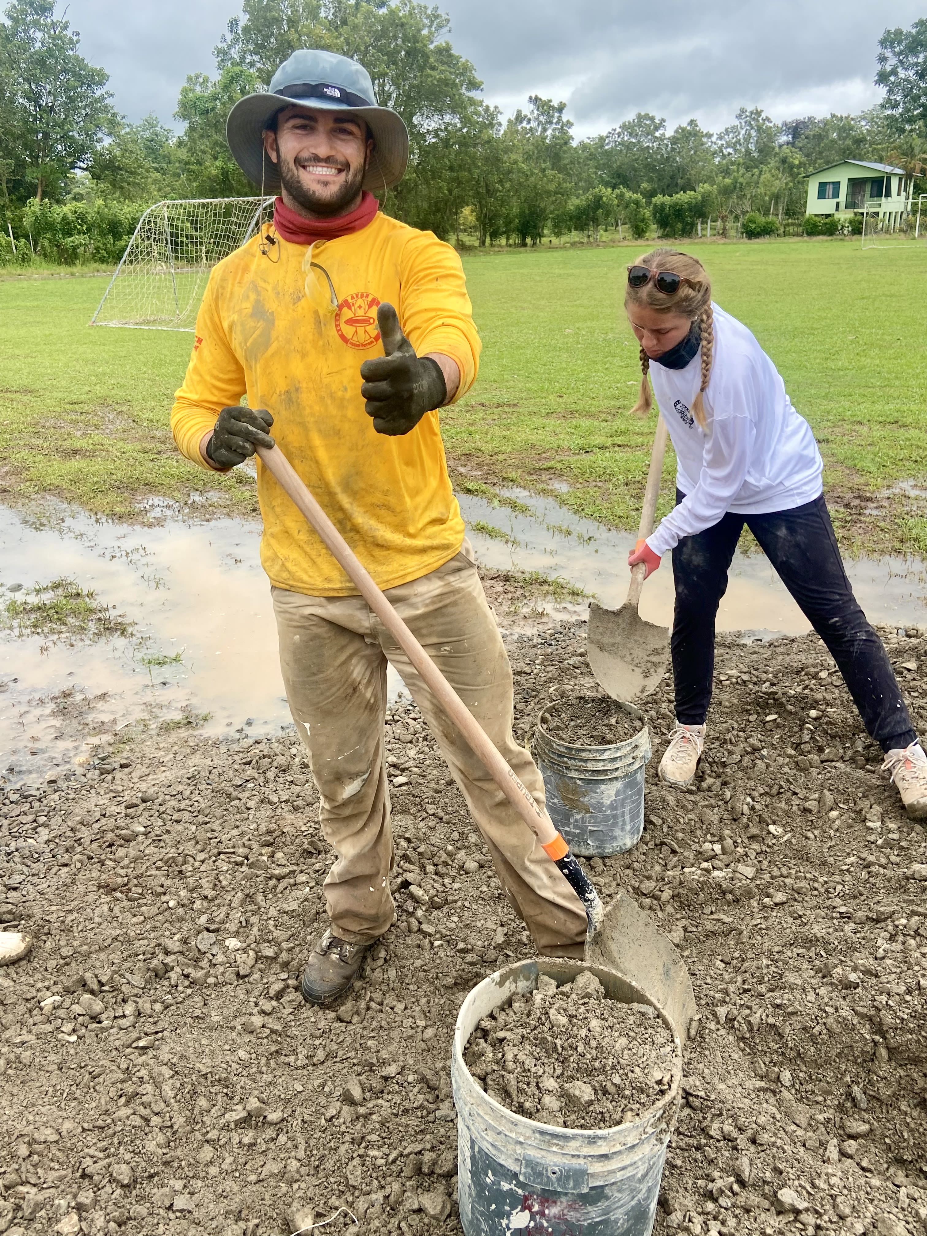 Each workday in Waldeck began at 7 a.m. with breakfast—usually consisting of eggs or chicken accompanied by rice, beans, and coffee. After breakfast, the team either played games with the local children or went straight to work, which included helping to load the concrete mixer, moving buckets, and shoveling sand and gravel to build a basketball court for the community.